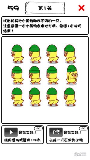 关卡中会有很多只小黄鸭,你需要找出动作不一样的一只,如果感觉有难度的话,可以使用下方的道具。