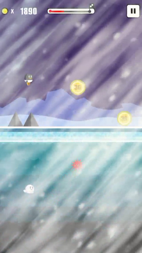 在游戏中玩家要控制两个角色前进。一个在陆地一个在水下,双方是同步前进的,必须二者兼顾才有可能通关,这对玩家眼力和反应能力的挑战又比其他同类游戏更进一步。