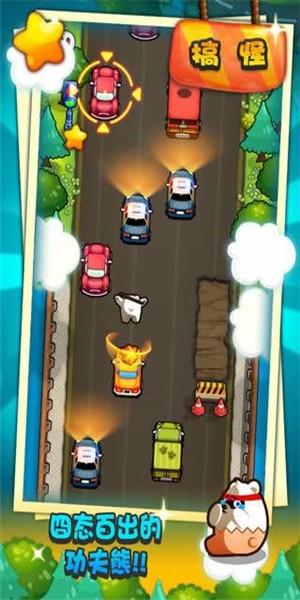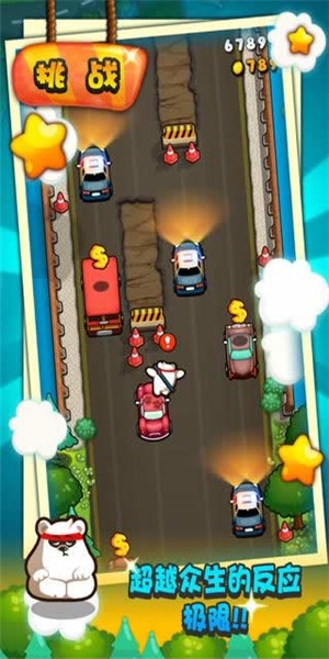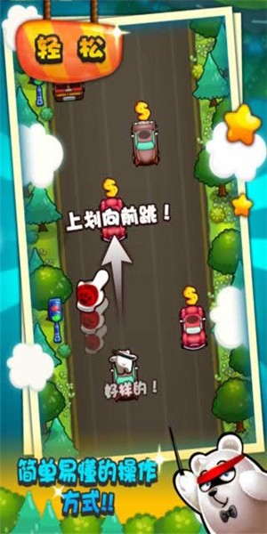 我们只要操控小白熊不停地在车辆间弹跳,并躲避着警车的抓捕;