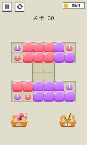 1.滑动到与泡泡颜色相同的图钉上面,即可消除泡泡;
