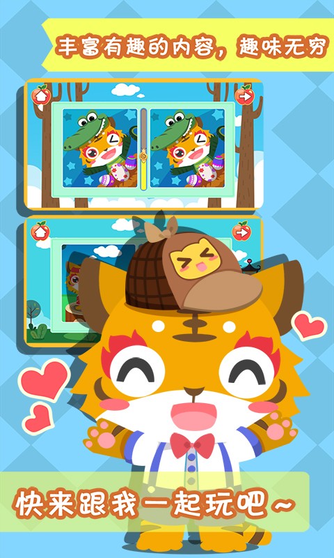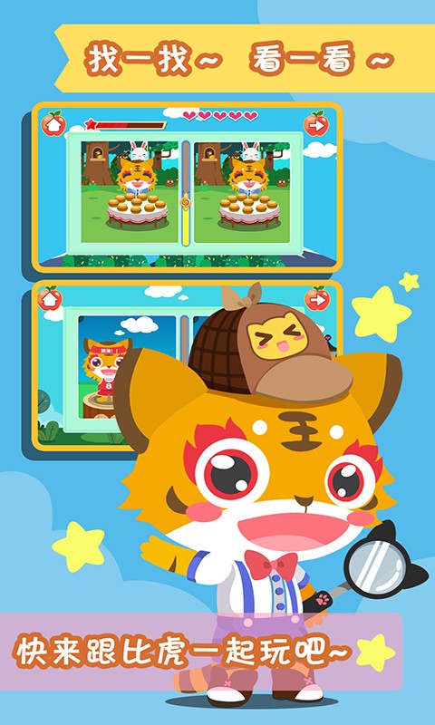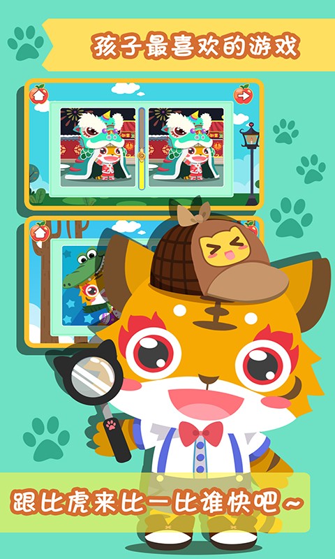 比虎儿童找茬游戏游戏是一款面向10岁以下儿童的早教益智游戏,可以有效促进儿童对颜色,形状,数学,动物,英文,绘画,音乐,地理,体育,传统文化的认知,启发儿童的想象力、记忆力、创造力。建议父母陪同孩子玩该游戏,在游戏过程中给予指导与教育。