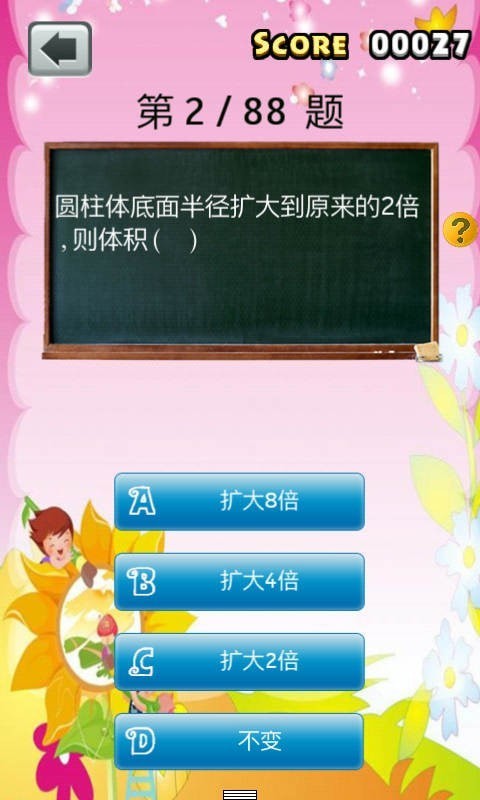 六年级数学是一款适合儿童启蒙教育的游戏。现在的小学题,往往让百科君怀疑自己怎么毕业的。对于现在的小学生压力真的很大,本游戏收录了人教版六年级的数学选择题,点击开始游戏,根据题目和提示文字,选择正确的答案。