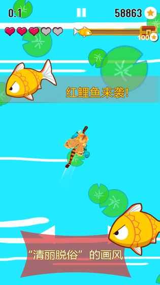 3、引诱追你的红鲤鱼相撞,会“生”出金鲤鱼。抓到它!越大的越值钱(积分)!