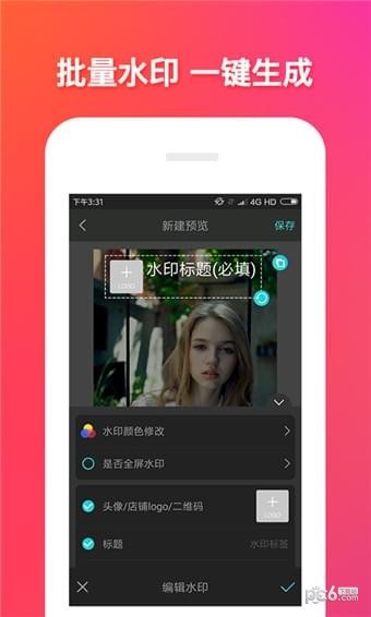 超方便添加水印,可以批量同时添加100张。水印内容支持自定义,N多在线水印模板。支持从相册上传logo作为水印。