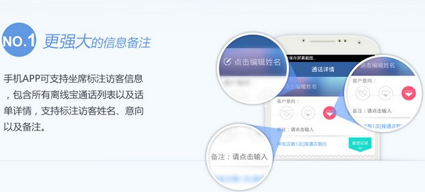 更强大的信息备注:手机APP可支持坐席标注访客信息,包含所有离线宝通话列表以及话单详情,支持客服标注访客姓名、意向以及备注。