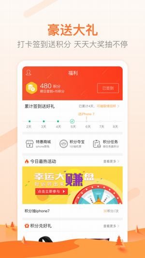 签到打卡赚积分,海量超值礼品,劲爆夺宝活动,优惠福利让你兑到手软