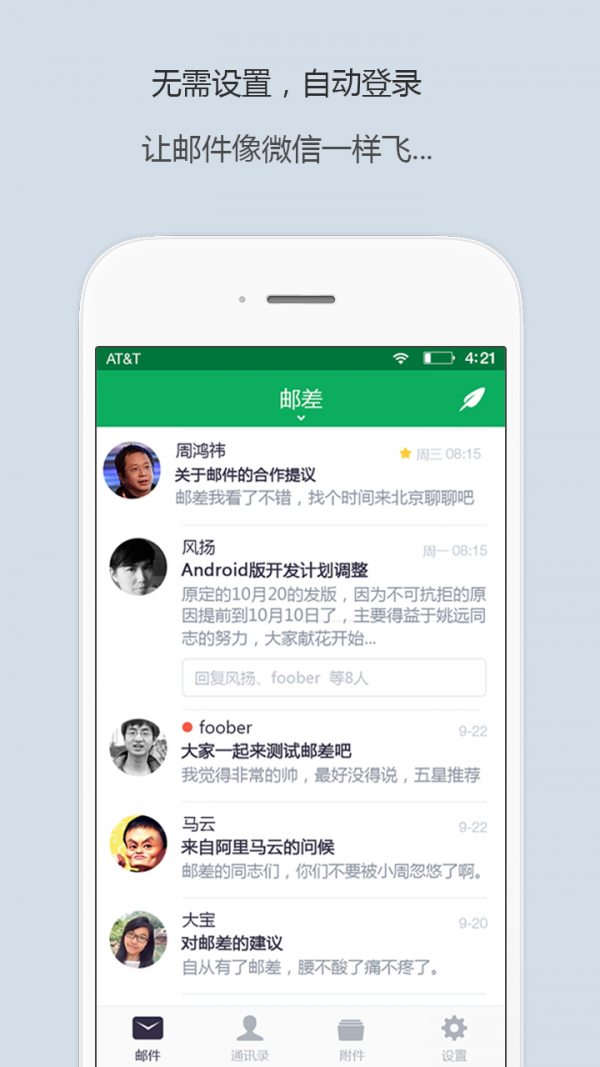 app是一款网络通讯应用,设计简洁,可及时推送消息、自动生成公司通讯录和分享文件等。此外app不仅仅是好用邮件应用,还能像微信一样快捷的使用邮件。