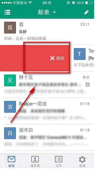 邮件列表支持向右拖动的删除手势;点击左上角图标可唤出邮件分类栏,方便分类查看「收件箱」、「发件箱」和「废纸篓」和邮件;左上角可新建邮件。