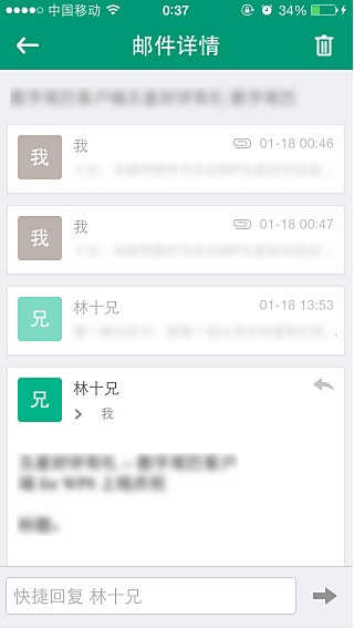 回复邮件也非常方便,点击下方输入框即可快捷回复。「」还会帮你把阅读中的邮件的寄件人和你之间的所有邮件一并显示出来,这样查看与寄件人的往来邮件就变得极其简单了。