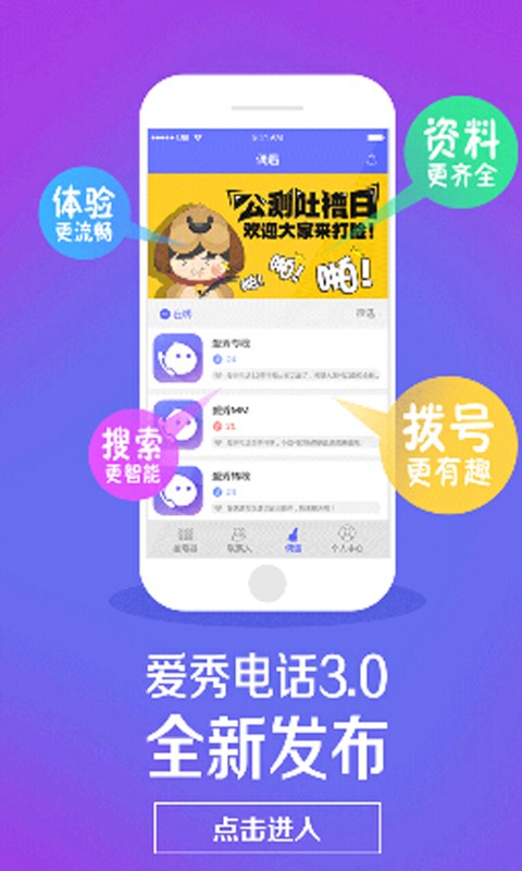 爱秀电话是一款手机免费电话服务软件,喜欢煲电话粥的童鞋,现在下载爱秀电话你就可以现实免费打电话了,无须对方安装一样可以,随意打任意打,节约话费还能赚钱,这么好的福利那只有爱秀电话才能办到,赶快来使用吧。
