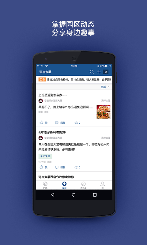 -你还可以随时向园区物业管理方吐槽和求助,你也可以和某个TA互动交流