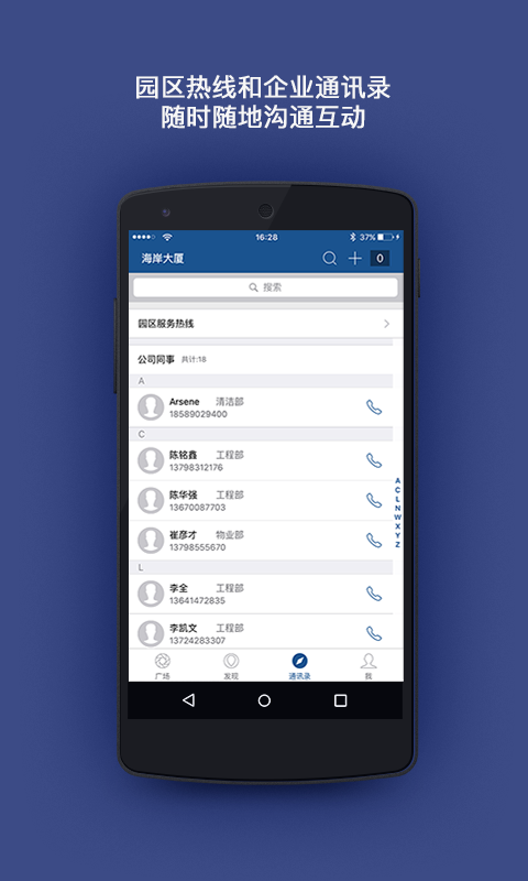 -除了它可以提供您能想到的所有园区服务,让你在园区工作和生活地更加得心应手:停车充值、物业缴费、公共资源预定、园区公告、企业通讯录…