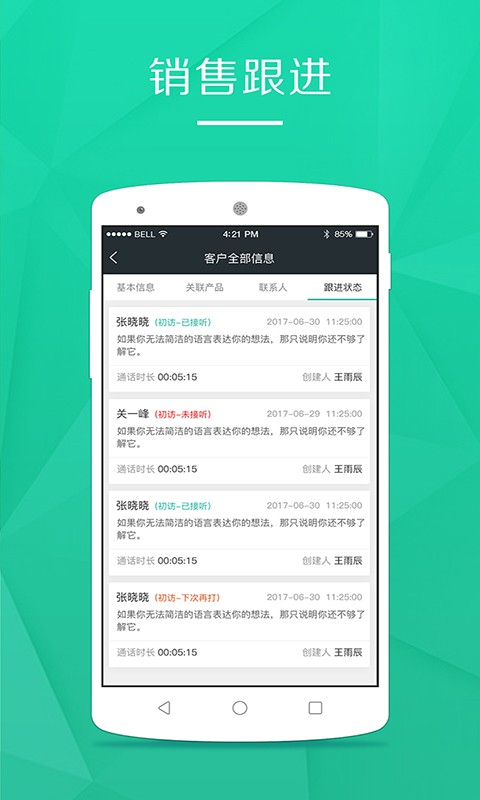 · 9500万+企业工商信息,大数据拓客并不难;· 客户公海,分配企业客户数据资料;· 销售任务设定,管理一步到位;· 坐席自动录音,有效提升销售技能;· 统计通话时长,速记通话记录;· 一键拨号,避免手工拨错;· 实时任务提醒,工作中的专业好帮手;· 自动添加客户微信,点对点营销;· 销售漏斗分析,让销售更科学。