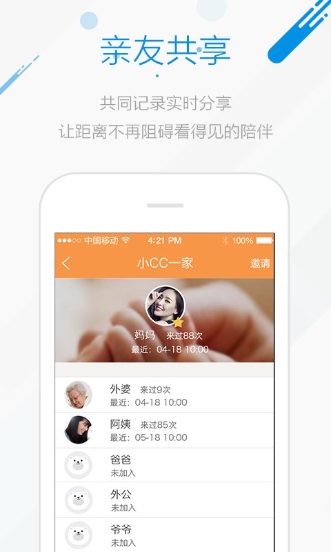 每个家长,都会慨叹,孩子飞快成长,曾经让你欣喜欢悦的重要时刻:出生、满月、会笑、蹒跚学步……却在记忆里模糊,在时光的飞逝中不知所踪。成长印记,与亲朋好友共同记录实时分享,让距离不再阻碍看得见的陪伴。