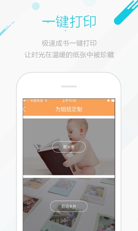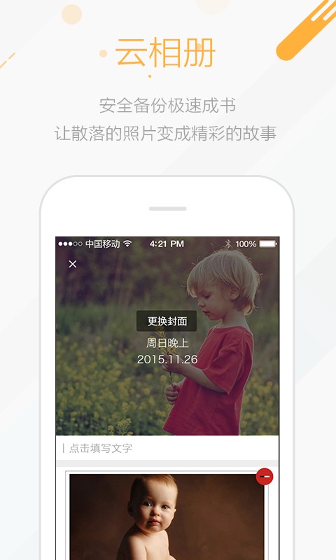 我们往往与亲人分隔千里,有一千万种的沟通手段,但内容却日渐苍白;父母亲人挂念成长中的宝宝,偶尔翻阅散落在聊天记录里的几张照片,但片段串不起记忆的时间线;成长印记云相册可以备份极速成书,让散落的照片变成精彩的故事。