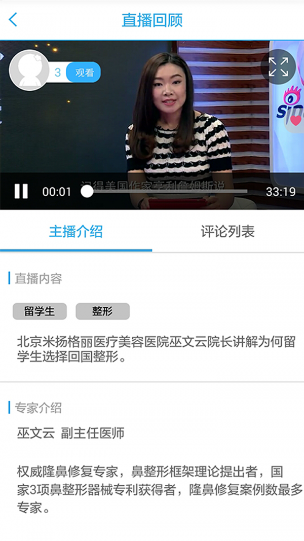【医脉圈】:查看美容整形相关的资讯,用户发表的更新话题和日记,了解其他医生的动态;【直播】:您可以通过发起直播或上传视频,增加与用户之间的互动,让求美者更加了解您;【消息】:足不出户就可以快速解答用户的疑惑,让更多的用户了解您的医学技术;【我】:个人资料信息管理,查看自己发表的案例、直播记录、话题、以及用户发表关于自己的日记。"