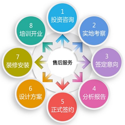投资咨询、实地考察、签定意向、分析报告、正式签约、设计方案、装修安装、培训开业、售后服务