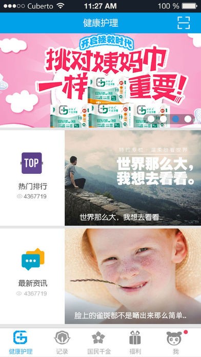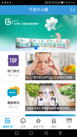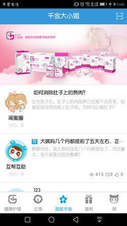app下辖“健康护理”、“记录”、“国民千金”、“福利”和“我”等5大模块;
