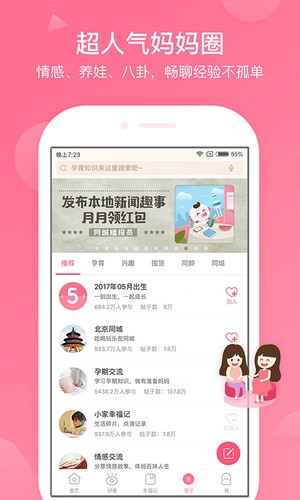 【妈妈圈】与同孕龄宝妈们畅聊,交流孕期问题及心得体会;跟全国辣妈们唠嗑,分享育儿、情感及时尚等话题。