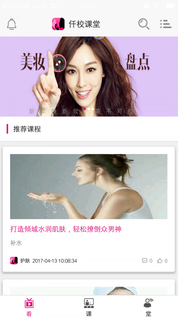 在app“看”栏目里面可以查看相关热门的护肤美妆内容,“课”栏目里面我们聘请专业的美妆老师向大家讲解我们日常护肤经常遇到的问题及解决办法,形象设计相关的视频,“堂”栏目里面大家可以进行互动并且记录自己的学校笔记等。
