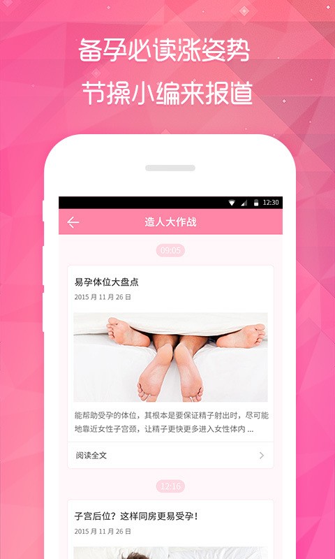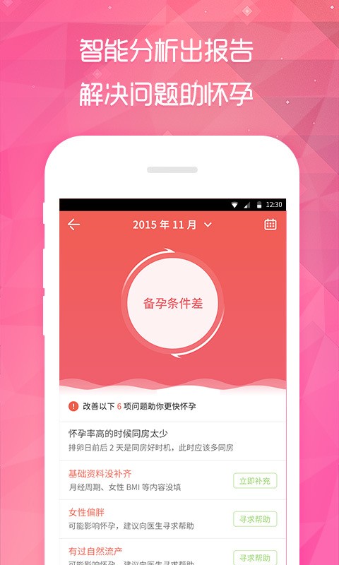 【智能管理】智能分析备孕数据,个性化定制排卵提醒、可孕指数、同房指导、验孕提醒、营养助孕等服务,健康报告实时查看,备孕过程持续记录、轻松管理!