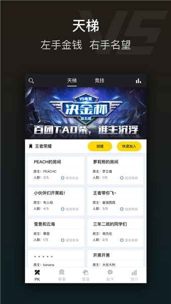V5电竞app致力打造一个集赛事、PK、陪玩及社交于一体的手游竞技平台。V5电竞app让电竞不再是少数人的游戏,而是全民的活动,让电子竞技触手可及。