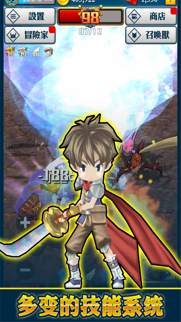 1、单手操作,角色自动攻击怪物,玩家只需配合发射技能。