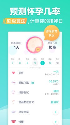海量数据和丰富的预测经验,综合【月经周期】、【基础体温】和【排卵试纸检测】功能,超级算法让你提前预备最重要的日子!