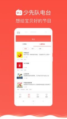 【电台】家长可通过APP将故事推送至孩子红卡,让孩子收听。数字红领巾平台作为少先队内容官方发布平台,将各地区优秀的少先队内容呈现在APP中,为孩子成长提供健康的指导,引领孩子德育教育;同时我们也有丰富的少儿故事给家长选择,在内容中陪伴孩子成长