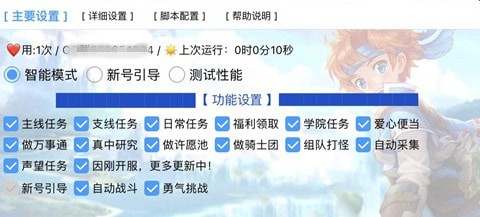 3、选择免费辅助挂机脚本,设置好脚本功能,点击开始挂机;