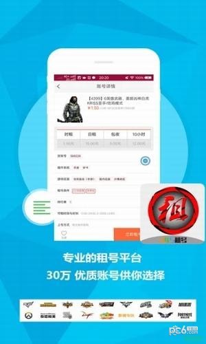 app提供海量游戏账号出租,app包含PC,IOS和安卓游戏,全网1元起出租,瞬间让你体验高富帅的游戏账号.