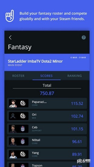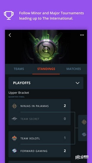4、锦标赛:锦标赛页面是获取每一项Dota职业巡回赛赛事时的主页。除了整体的巡回赛排名,还可以找到参赛队伍、赛事排名和比赛详情的细节——包括财产总和图表、英雄数据等等。随着锦标赛的进行,小组赛和淘汰赛的对阵会持续更新,显示完整结果。