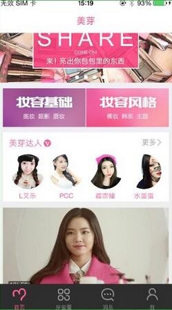 打开客户端,首先看到的就是它的【首页】栏目,在这里,用户额可以看到一些达人和他们的美妆视频,同时还可以通过妆容基础和妆容风格选择自己喜欢的美妆视频观看