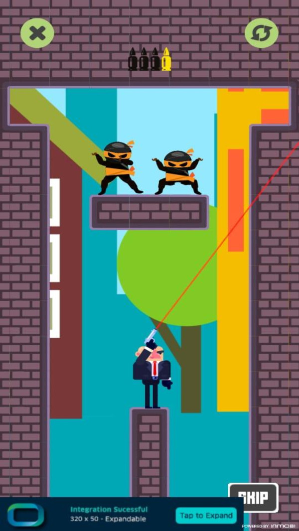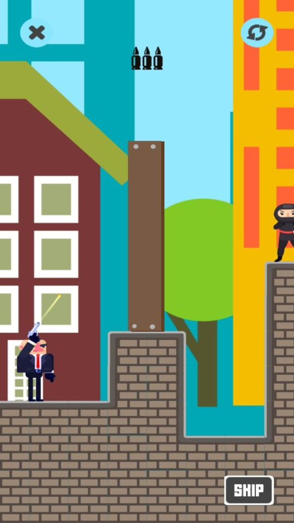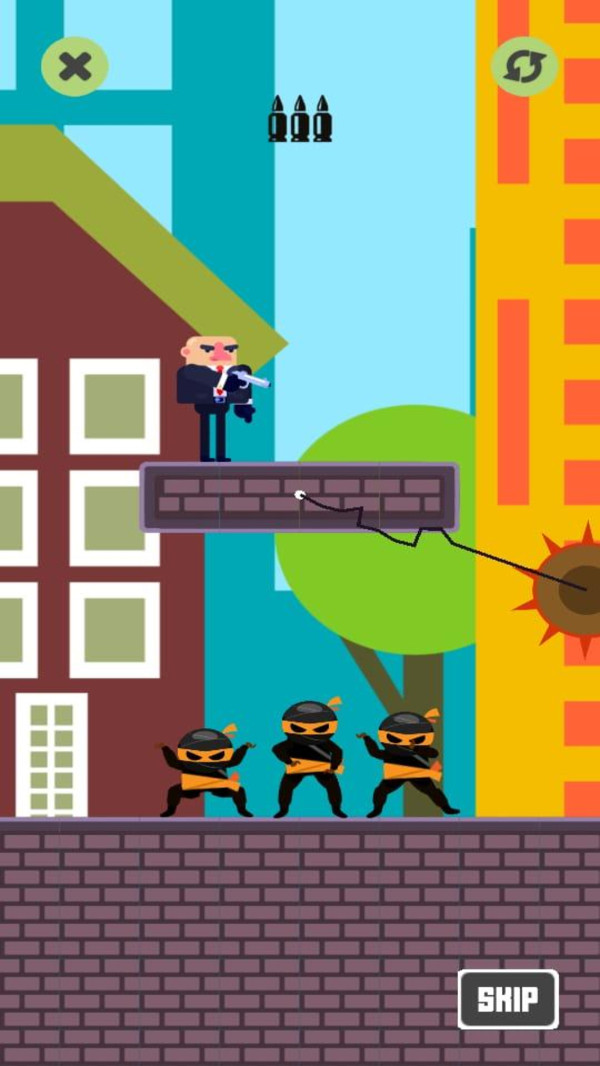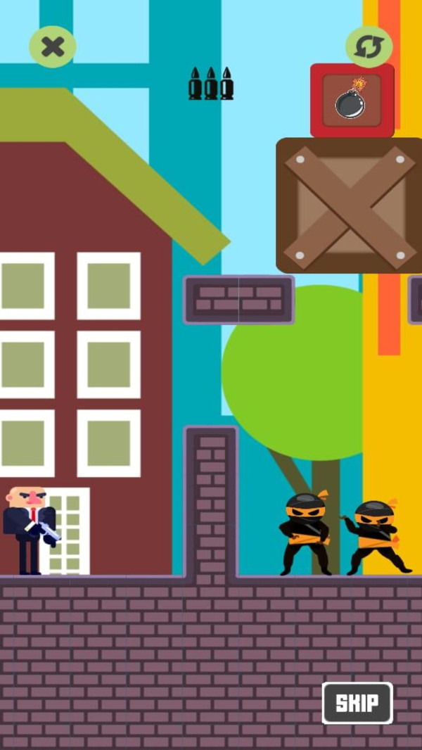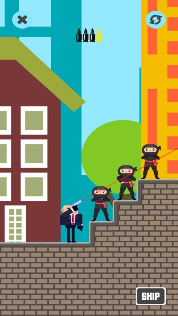 翻转射手是一款卡通风格的趣味城市射击游戏。玩家在游戏中饰演身材魁梧的杀手,玩家需要不断向前,消灭一起阻挠你前进的忍者,收集子弹,运用物理原理,射击那些躲在障碍后方的敌人。