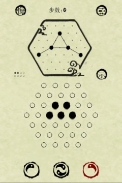 《墨盘》是一款拥有独特创新游戏玩法的休闲益智游戏。墨点与墨圈拼成六边形阵列,点击一个非边缘点,同一六边形顶点的墨点与墨圈联动。有三种联动方式:顺时针一格、逆时针一格、对角互换。经过变换,拼成目标图案即可通关。