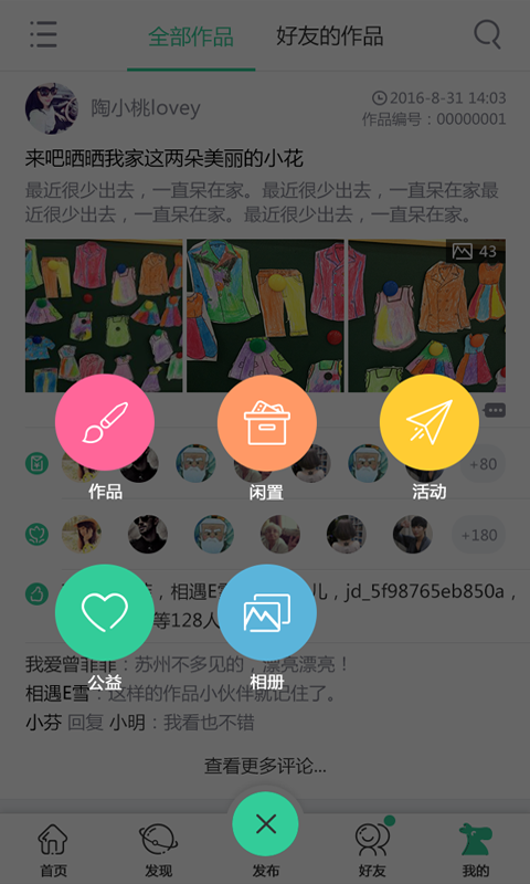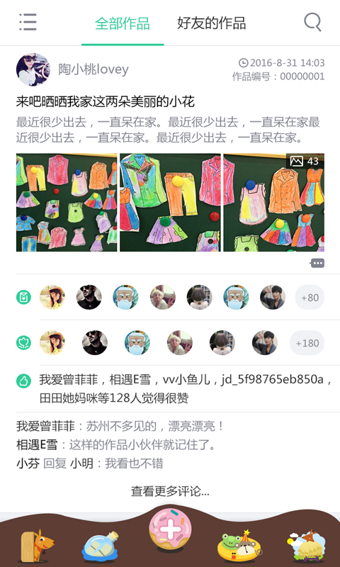 【作品展览】发布作品,通过他人点赞、送花、评论、打赏等方式,增加小朋友的自信。让小朋友在鼓励中进步,在赞赏中成长!