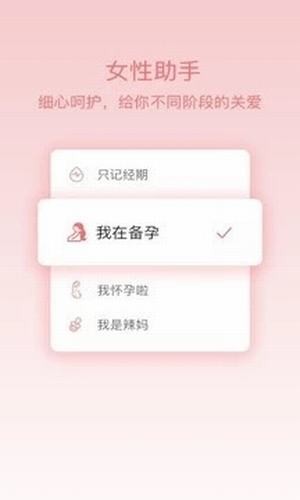 app细心设置只记经期、我在备孕、我怀孕啦、我是辣妈四个阶段。针对经期、备孕、怀孕、辣妈四个阶段推出四种模式,呵护女性成长每一天。