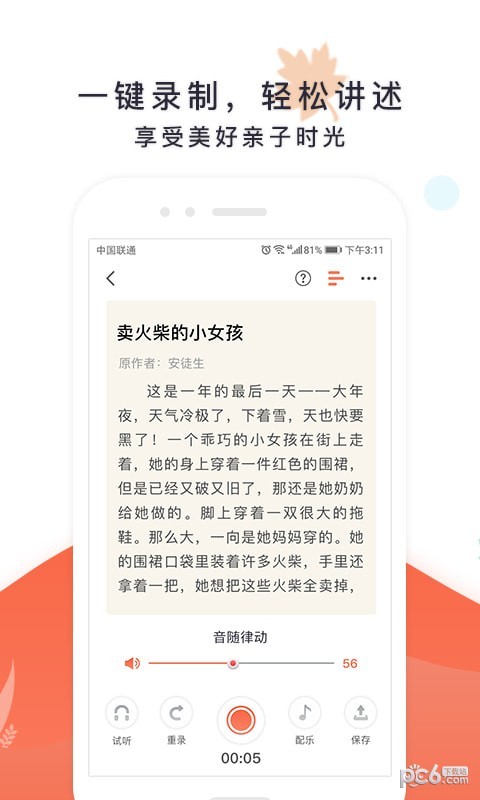 4、配乐录制:7大类近百首专业故事配乐,不同故事配不同配乐,录制一键合成,一键分享;