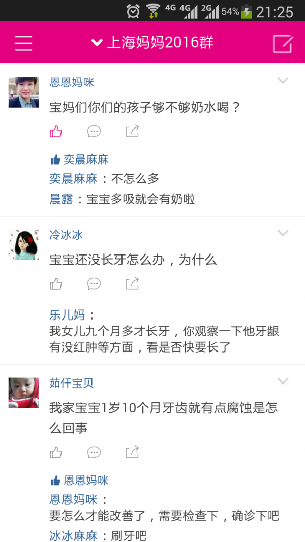 妈妈群app是按宝宝出生年龄段设置的,加群后,可以与众多本地的妈妈们交流育儿经验,还经常举办亲子活动及打折、优惠 、福利放送哦。