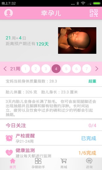 app是一款功能齐全的孕期管理工具,通过在app你可实时监控孕期健康信息,快捷的记录/查询产检记录,以及在线购买母婴用品等。