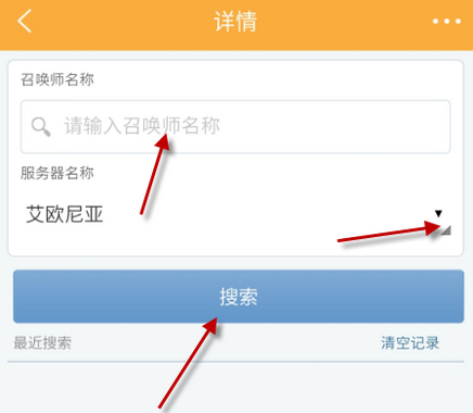 2、输入召唤师名称,选择服务器,点击搜索就可以了