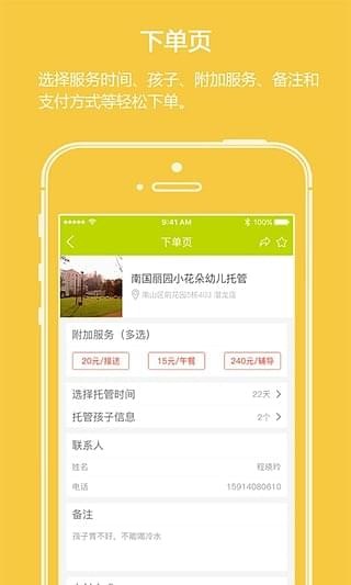 下单页:选择服务时间、孩子、附加服务、备注和支付方式等轻松下单