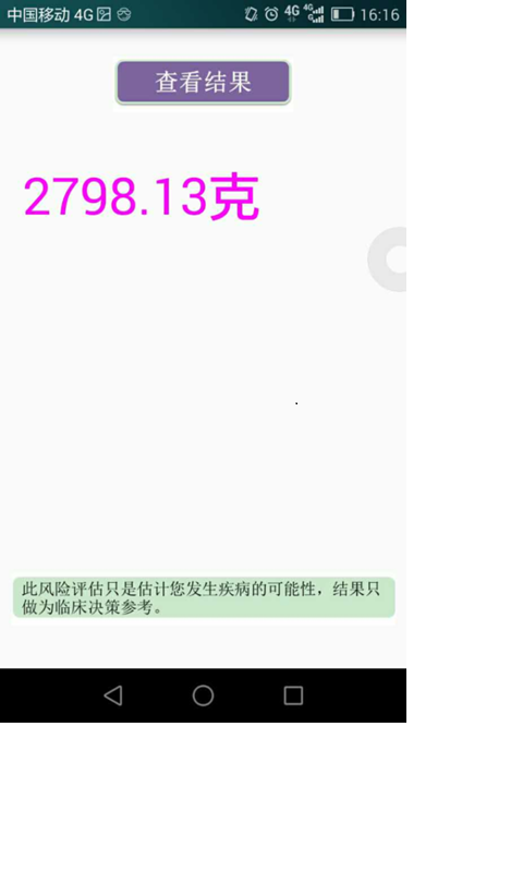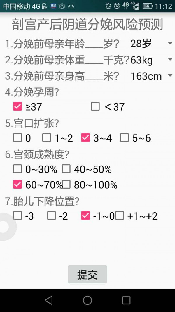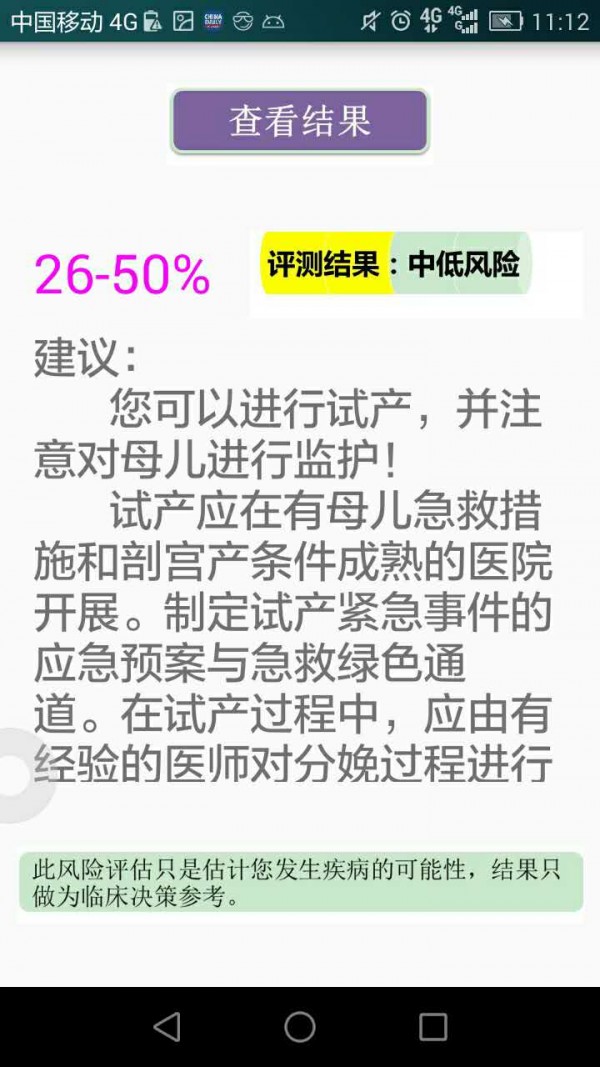 利用这款软件,孕妇可以根据自身的一些情况,如:年龄、产妇分娩前体质指数(BMI)、分娩孕周较小,宫口扩张、宫颈管消退和先露位置评分等,来评估自己的VBAC成功率的高低。该软件根据风险预测模型,给出VBAC成功的概率;并根据概率把VBAC的风险分为了四个等级:低风险、中低风险、中高风险、高风险。然后根据孕妇VBAC风险的高低,软件会给出相应的咨询和建议。