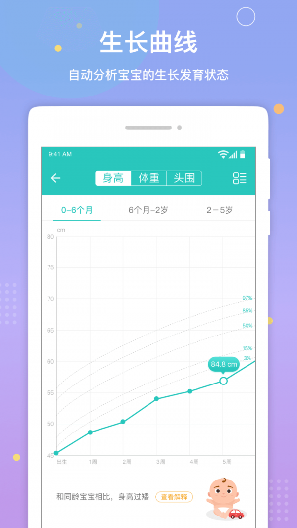 想要时刻跟踪记录宝宝的生长发育状态?用棒米生长发育仪吧。只需简单的测量,数据就可以自动上传到app,同时将自动生成专业的生长曲线,分析宝宝的生长状态。此外,app提供包括身高体重、进食、睡眠等的记录功能。