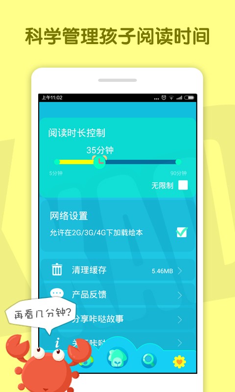 2、听书功能:家长可以设置成“单独听”(15分钟,30分钟,45分钟及不限制)让成为孩子睡前故事专属电台。