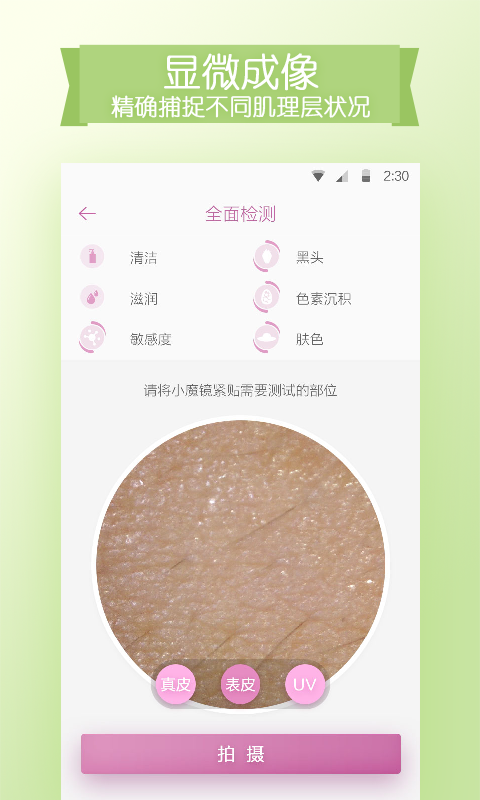 100倍高清光学显微镜头,从肌肤的清洁度、滋润度、敏感度、黑头、色素沉积等五个维度,检测皮肤的当前的状态,深彻评定肌肤状态。