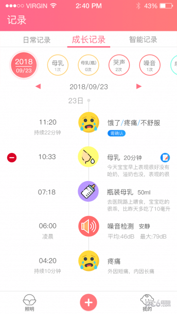 【智能记录】 多种育儿情景添加,记录宝宝成长的一点一滴,更有智能设备记录,让育儿更轻松。