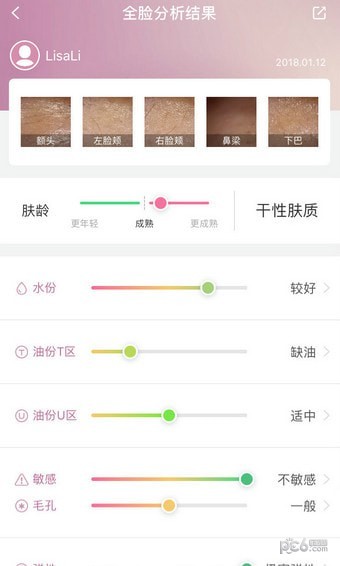 “大眼睛”能提供一份包括肌肤:油性、水份、敏感性、色泽度、毛孔和弹性6个维度的诊断分析报告,还能测试你的肤龄!