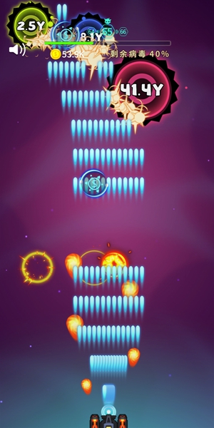 2、完成所有的冒险开启无尽射击之旅,超有趣的闯关玩法,每种病毒上斗写着攻击的次数,尽量不要碰到病毒;