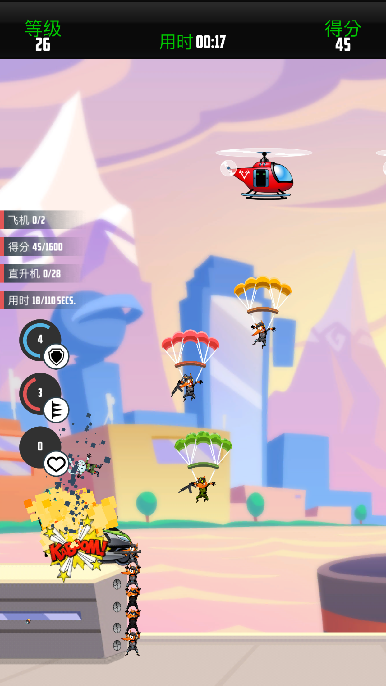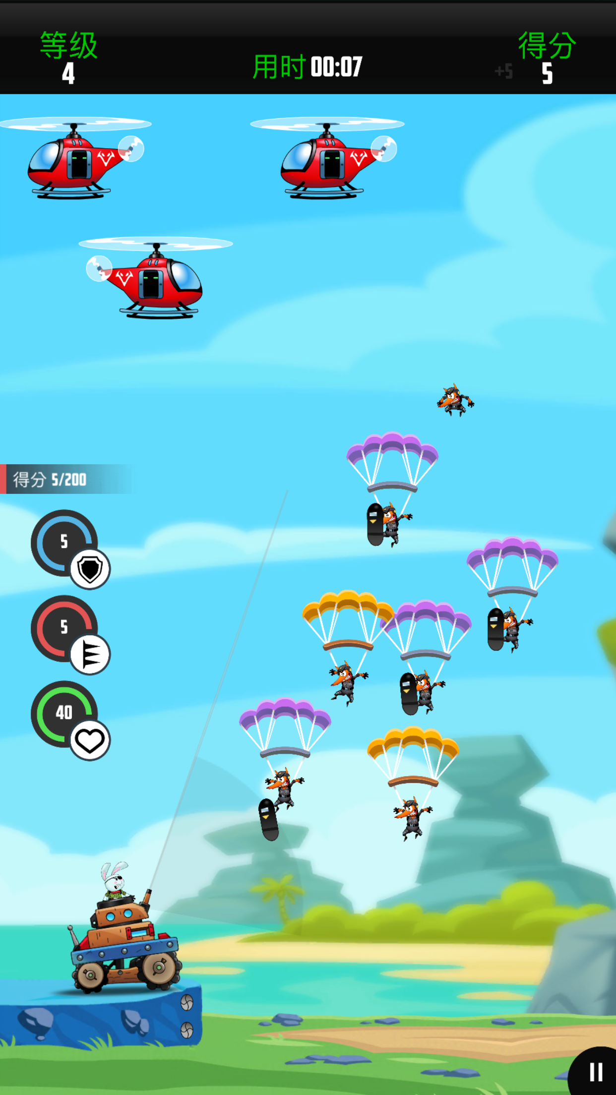 狐狸伞兵是一款极其有趣的动作射击类手机游戏,一大群的狐狸将从直升机内掉落,它们乘着降落伞下来就是为了抓可爱的兔兔的,你需要做的就是保护兔兔们,不断射击从天而降的狐狸伞兵,在它们着陆之前,帮助兔子射击它们!